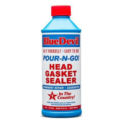 The sixteen oz. Cascade-N-Become BlueDevil Head Gasket Sealer is formulated for the Do-it-Yourself client who has limited fourth dimension, or is not mechanically inclined. BlueDevil Pour-N-Get Head Gasket Sealer is intended for the customer seeking a single repair on a 4 or vi cylinder engine. The ease of use, along with the savings in price, brand this 16 oz. BlueDevil coolant leak sealer an excellent retail option.